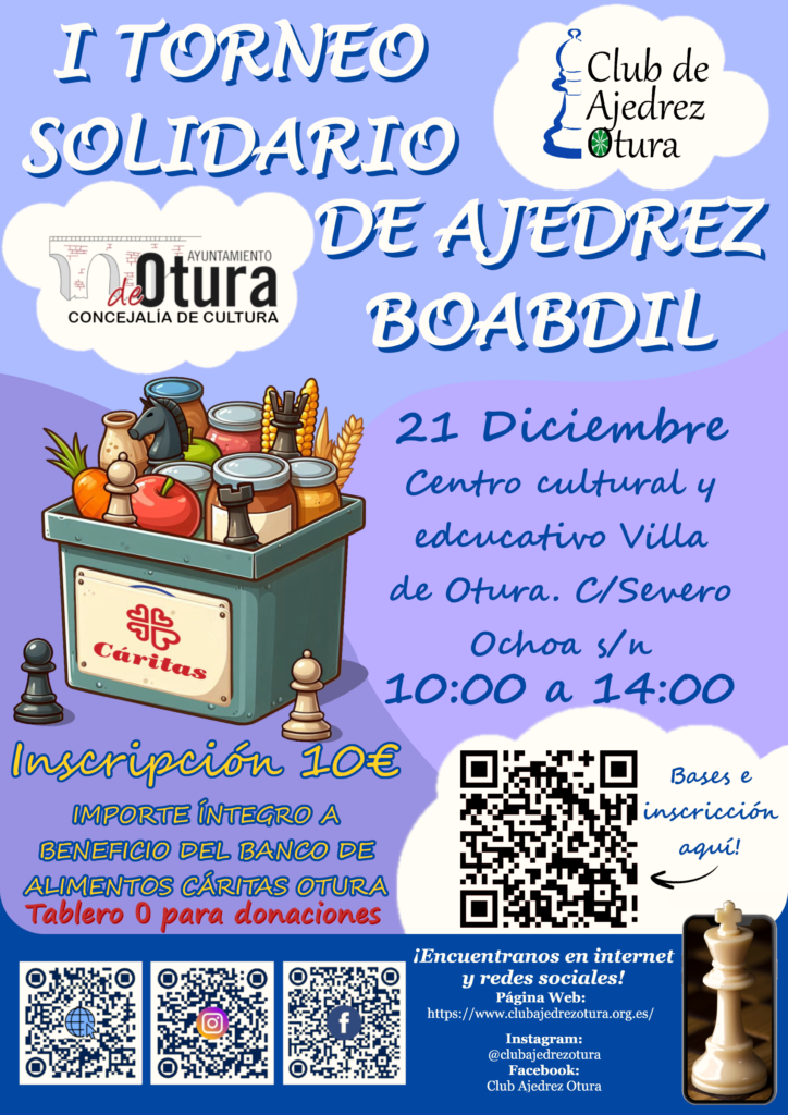 La inscripción es de 10 euros, que será donada íntegramente a Banco de Alimentos Caritas Otura. Este importe se abonará por transferencia bancaria al número de cuenta del Club de Ajedrez Otura: ES16 3023 0162 1271 0354 7209 especificando en el concepto “Inscripción Torneo Solidario”, o en efectivo el mismo día del torneo, antes del comienzo del mismo. La inscripción no es firme hasta que no se ha abonado la misma.